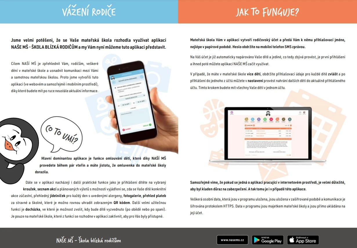 spouštíme nový informační kanál Naše MŠ- ŠKOLA BLÍZKÁ RODIČŮM. Plná aktivita je naplánována na začátek roku 2025. Prostřednictvím této aplikace budete mít možnost omlouvat nepřítomnost svých dětí, dostávat důležité zprávy a aktuality týkající se dění v naší školce. Aplikaci si můžete stáhnout do mobilu nebo s ní pracovat na PC.