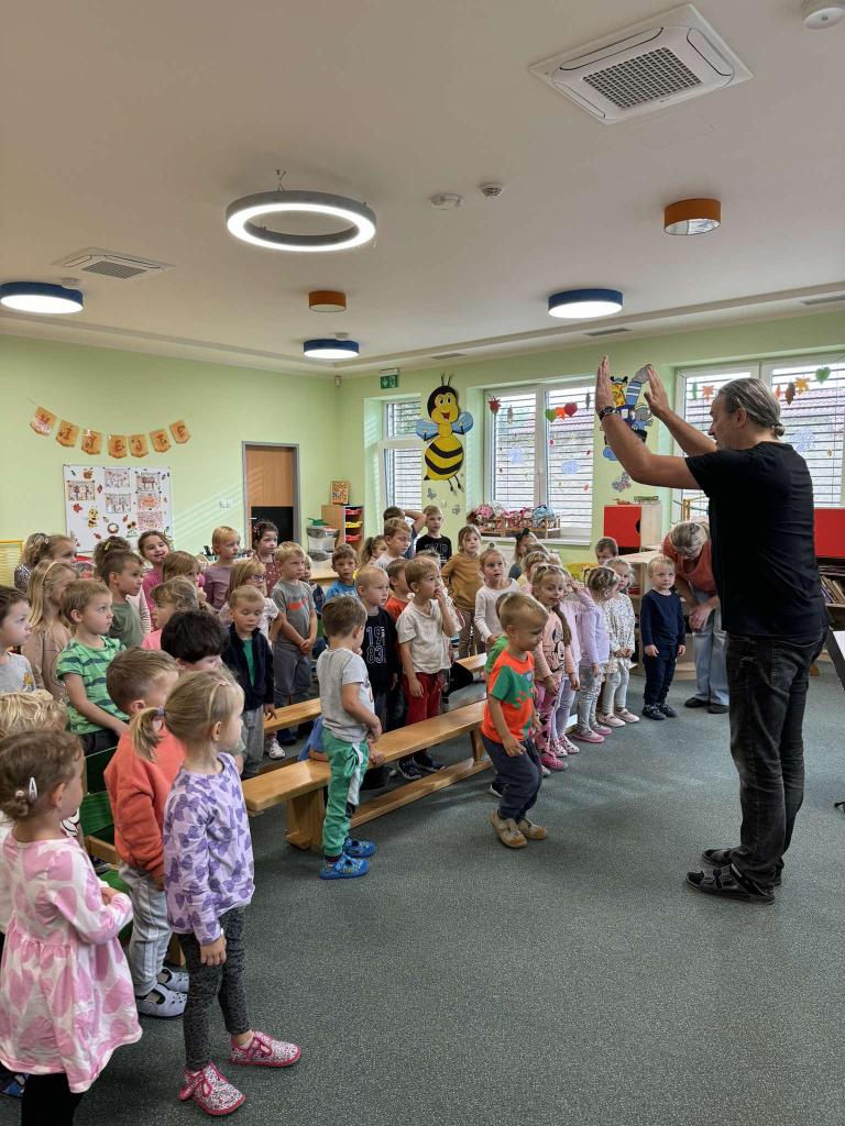 Dne 3.10.2024 MŠ navštívil pan Bílý, který pro všechny děti ze školky připravil hudební vystoupení ,,Z pohádky do pohádky". Písničky byly o známých pohádkách jako je maková panenka, maxipes fík, krteček a další... Vystoupení mělo veselou a hravou atmosféru a děti byly zapojeny do představení.