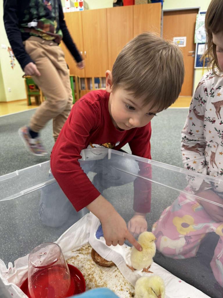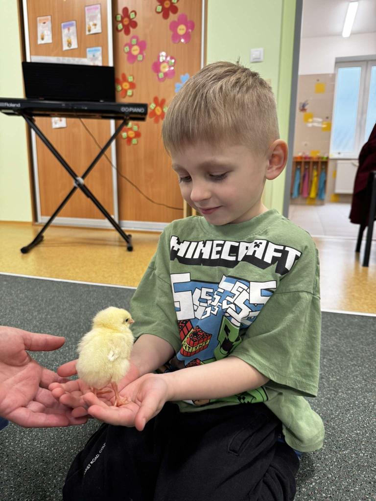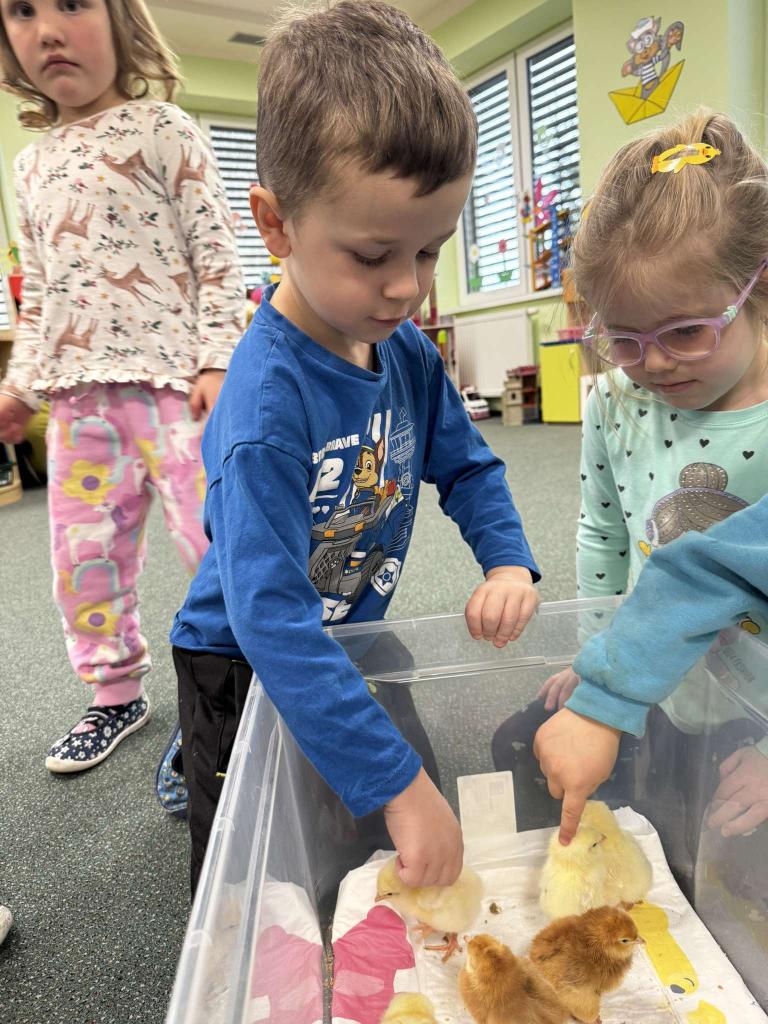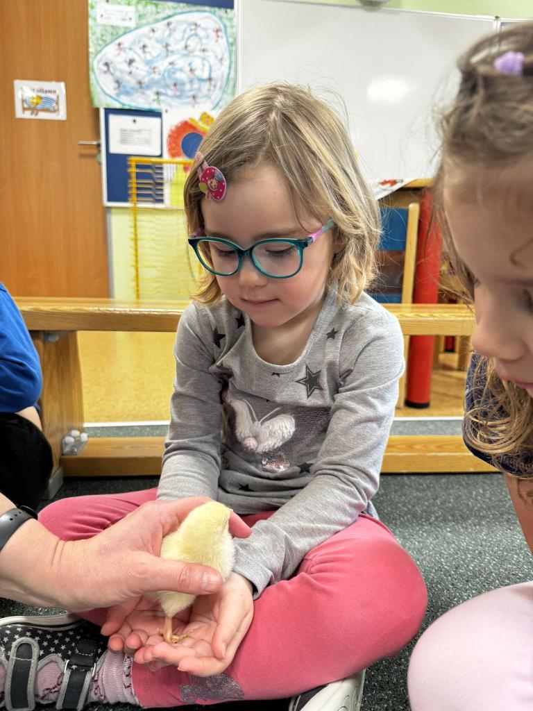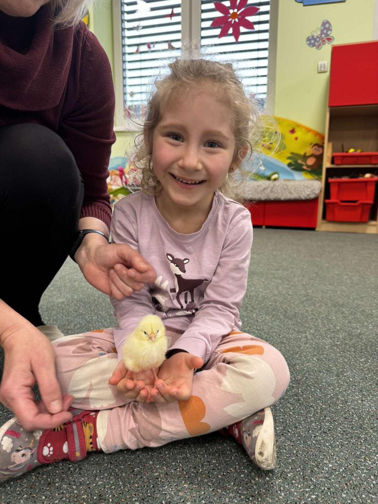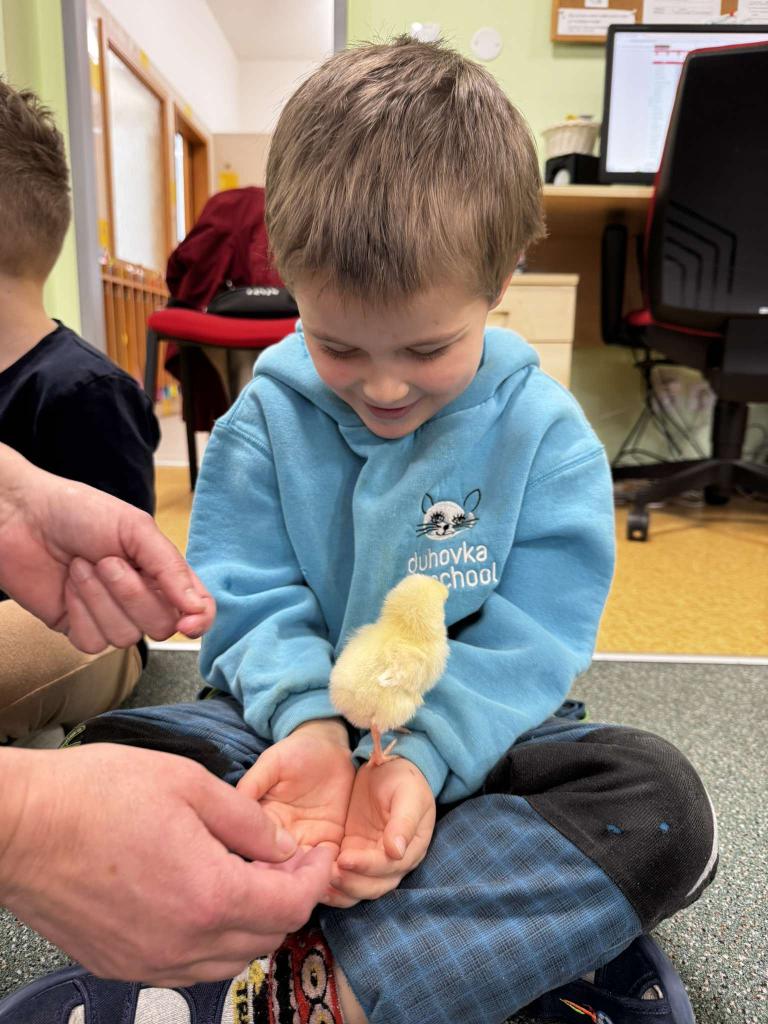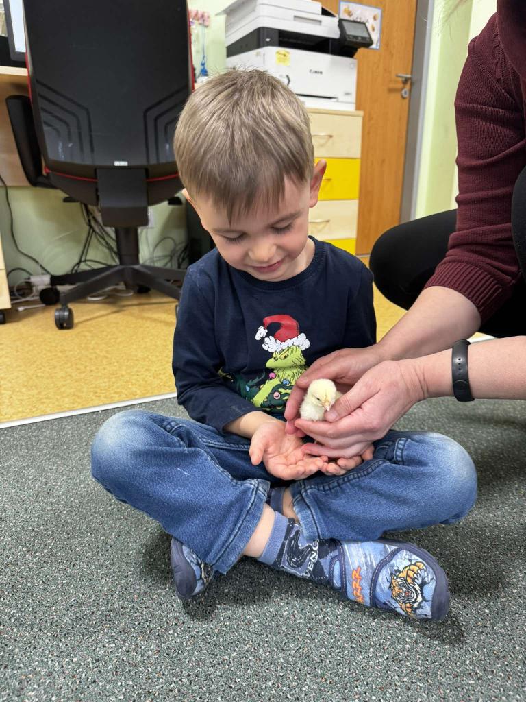 V tomto týdnu jsme měli jedinečnou možnost sledovat líhnutí kuřátek přímo ve třídě. Děti se skrze připravené materiály seznámily s procesem líhnutí a dozvěděly se více o tom, jak funguje líheň. Nechyběl ani osobní kontakt – kuřátka si mohly pochovat a pohladit. Zároveň si děti uvědomily, jaká péče a práce je potřeba k jejich chovu.